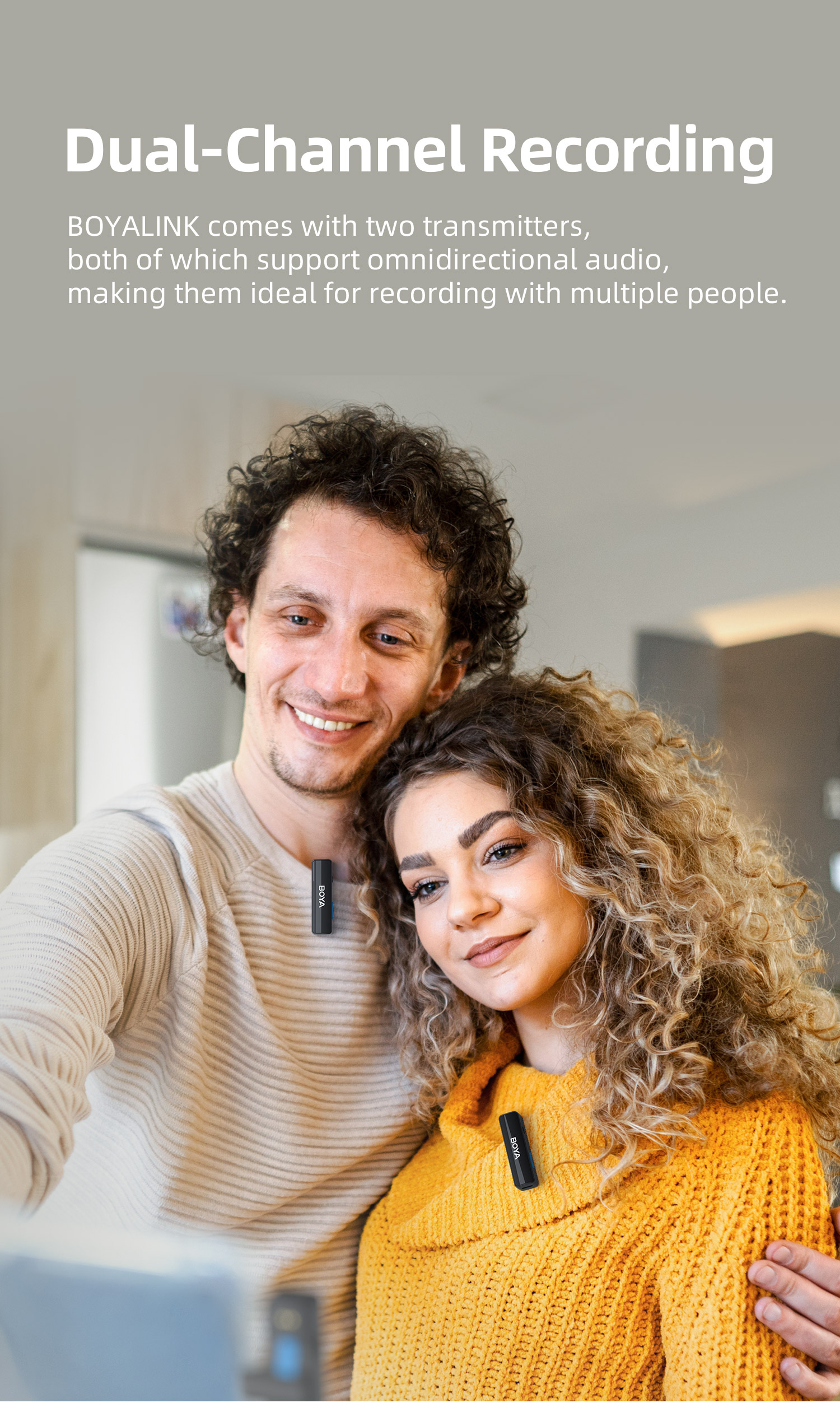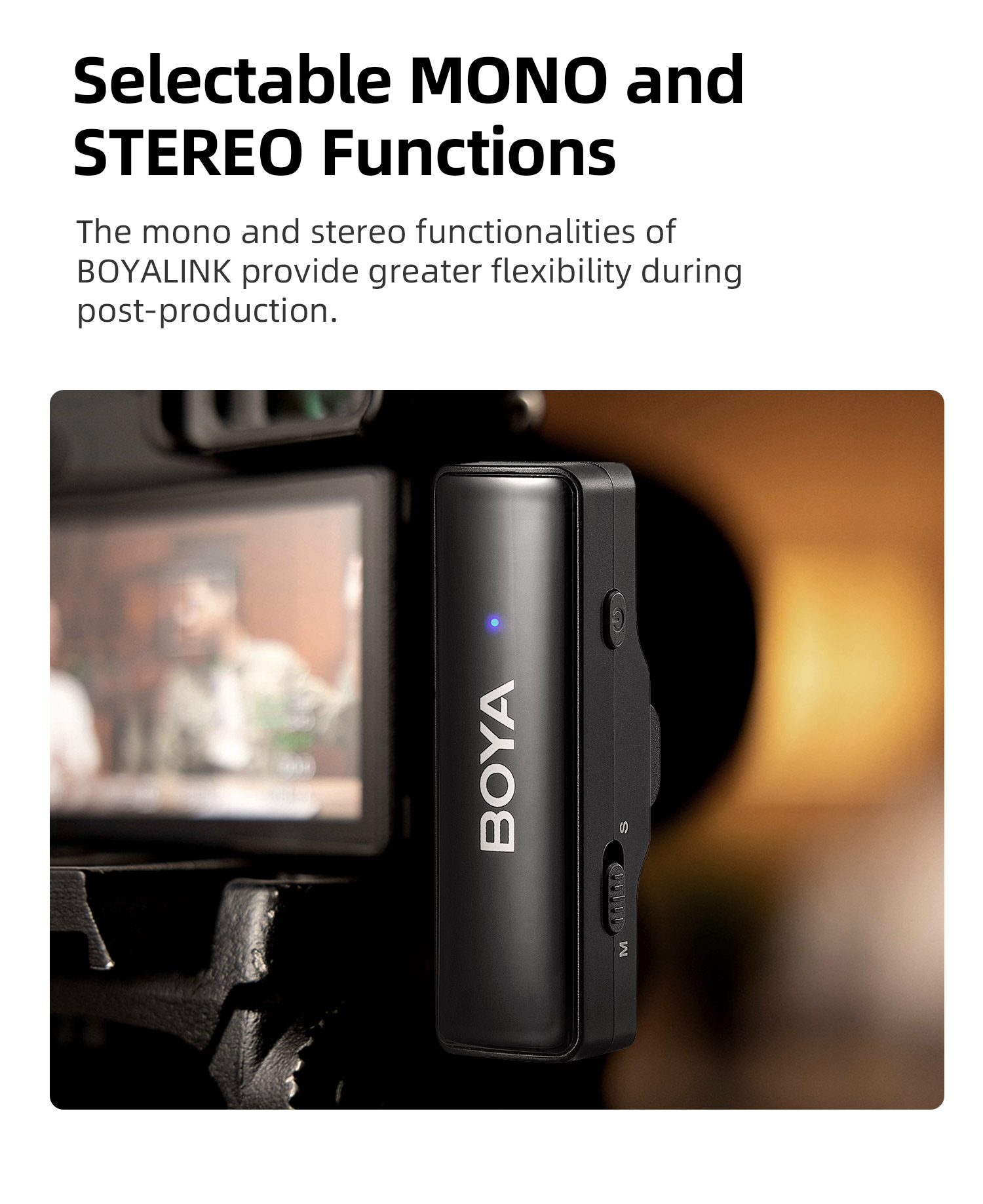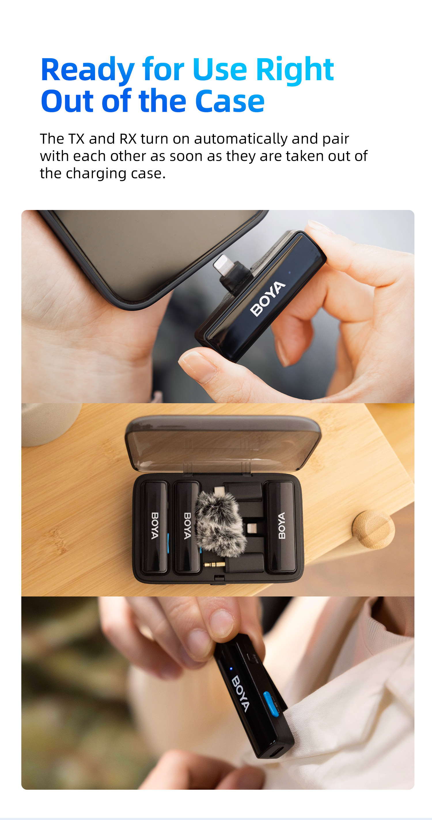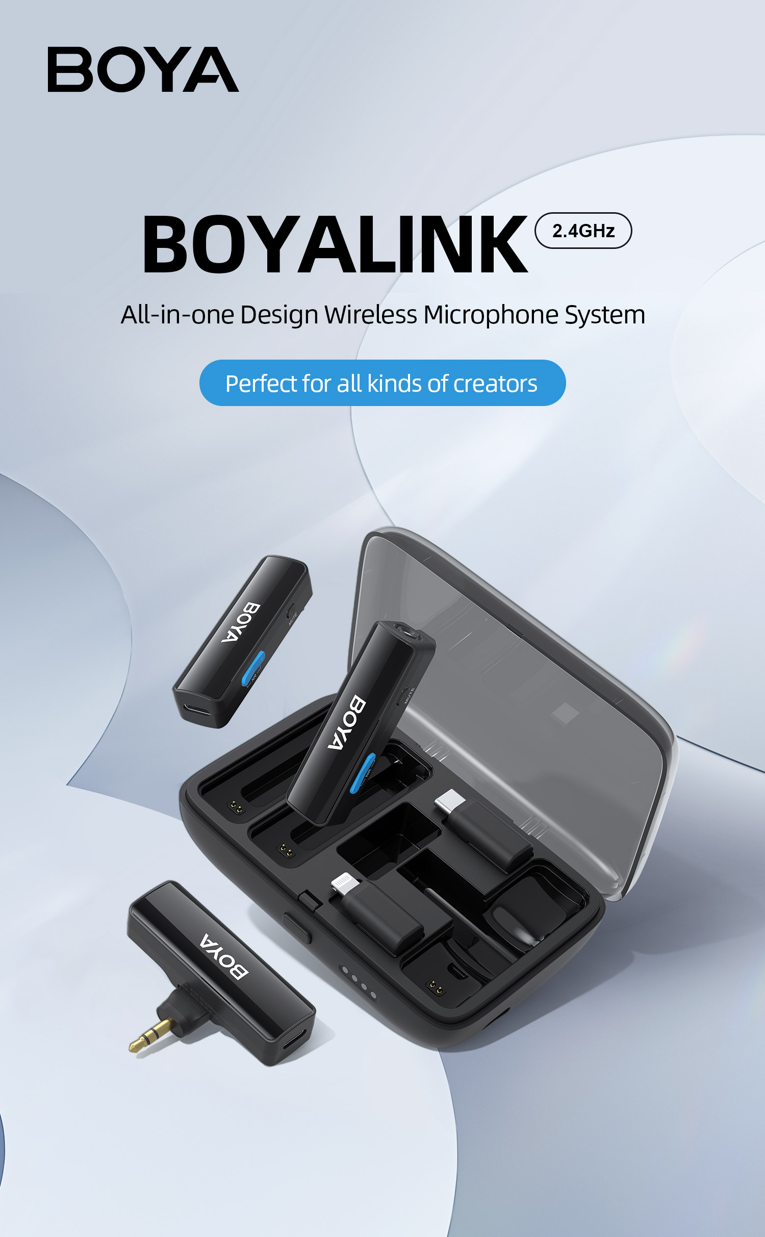 BOYALINK เป็นระบบไมโครโฟนไร้สายพร้อมช่องสัญญาณ 2.4G คู่ BOYALINK มาพร้อมตัวเชื่อมต่อ USB-C, Lightning และ 3.5 มม. TRS เป็นโซลูชันขั้นสูงสุดสำหรับผู้สร้างเนื้อหาที่ต้องการการบันทึกเสียงคุณภาพสูงโดยไม่ต้องวุ่นวายกับตัวเชื่อมต่อหรืออะแดปเตอร์หลายตัว การออกแบบที่เก็บข้อมูลแบบออลอินวัน เทคโนโลยีไร้สายแบบดูอัลแชนเนล และการตั้งค่าที่ใช้งานง่าย ทำให้เป็นตัวเลือกที่เหมาะสำหรับทุกคนที่ต้องการยกระดับการบันทึกเสียงไปอีกขั้น