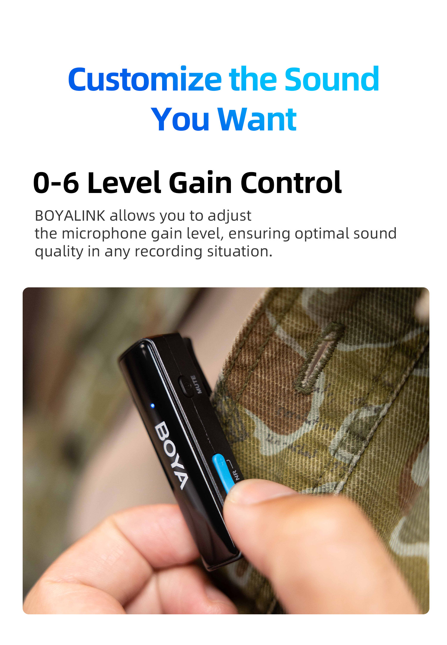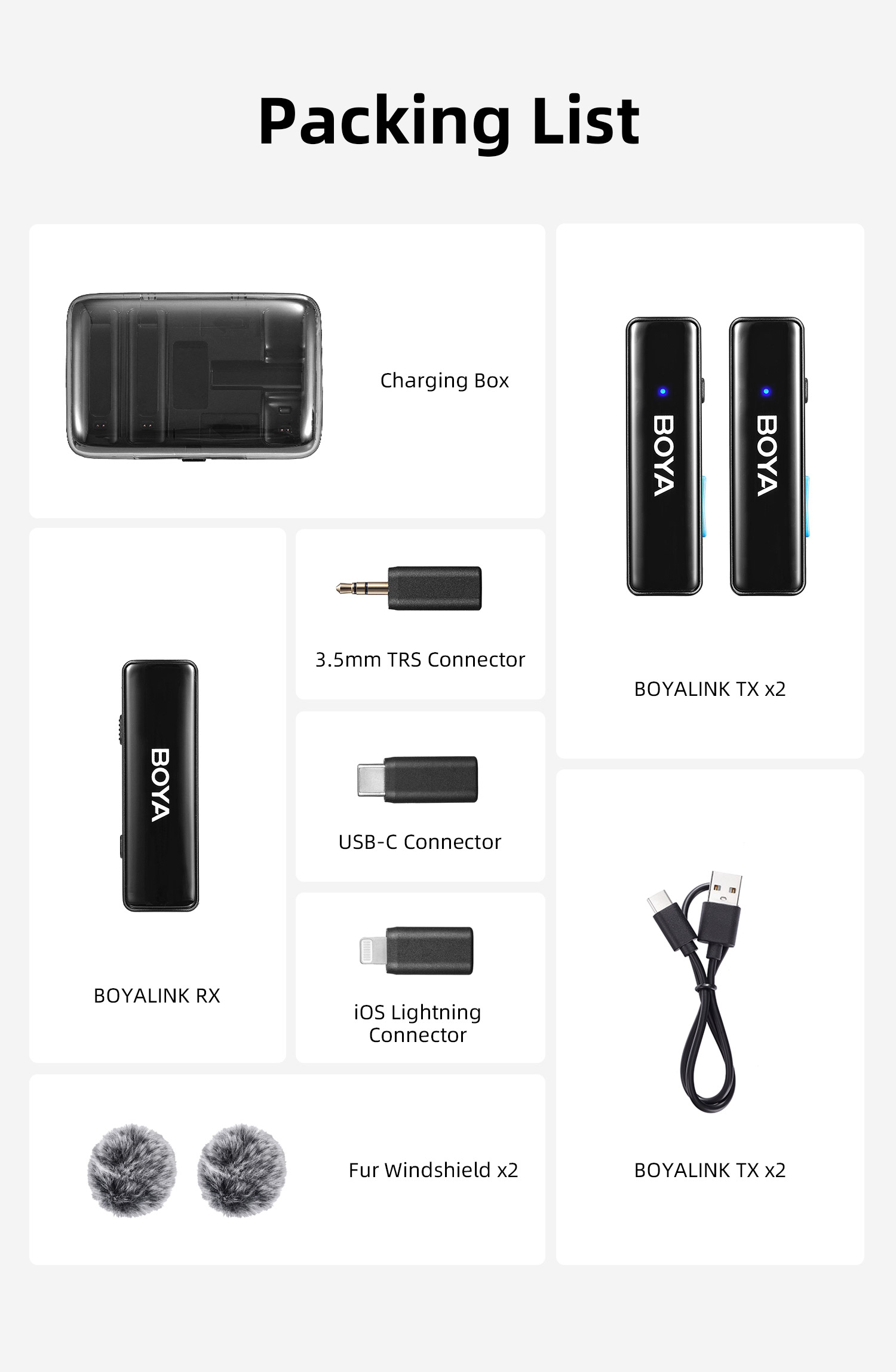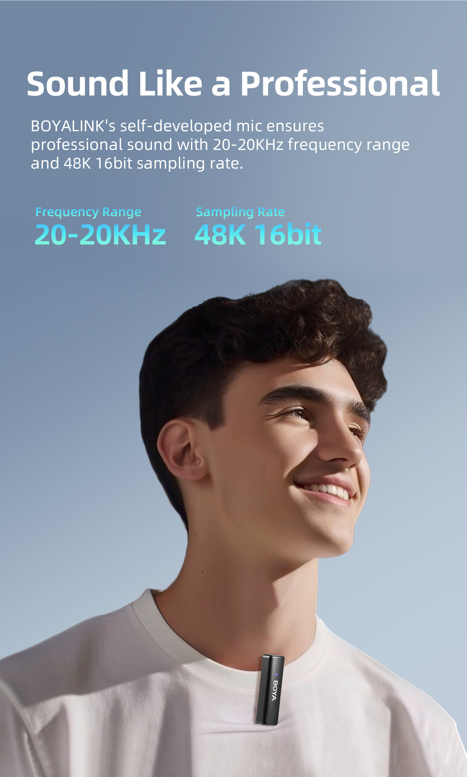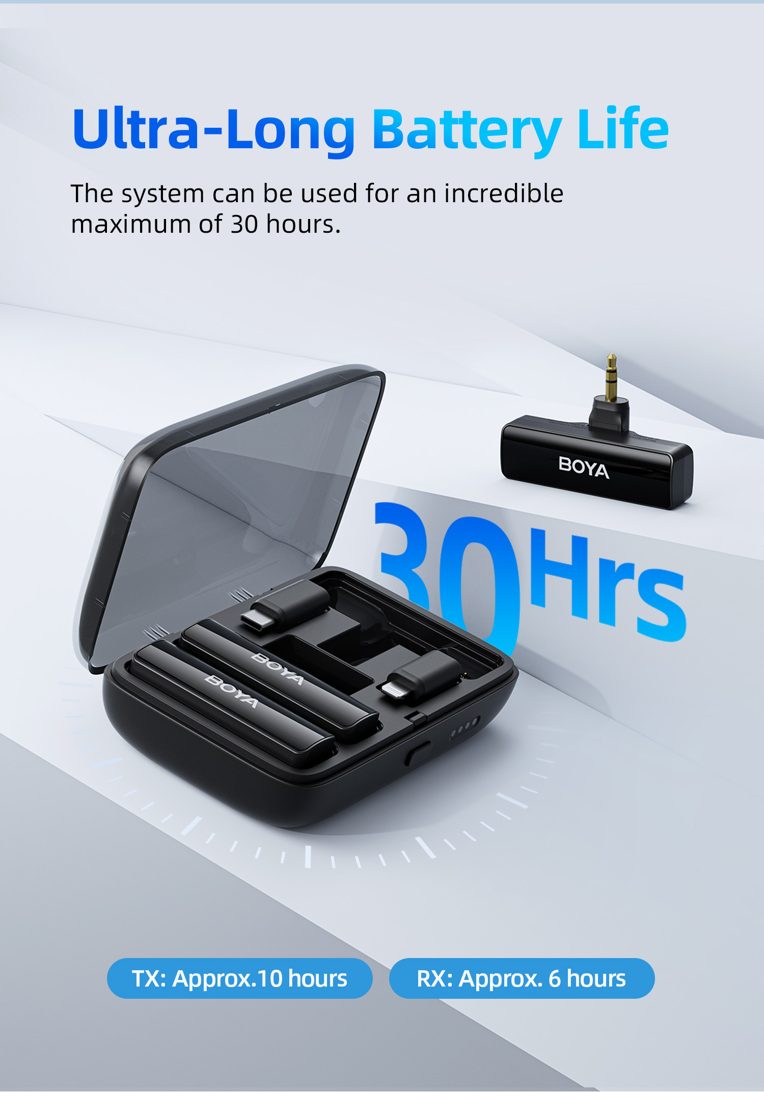 BOYALINK เป็นระบบไมโครโฟนไร้สายพร้อมช่องสัญญาณ 2.4G คู่ BOYALINK มาพร้อมตัวเชื่อมต่อ USB-C, Lightning และ 3.5 มม. TRS เป็นโซลูชันขั้นสูงสุดสำหรับผู้สร้างเนื้อหาที่ต้องการการบันทึกเสียงคุณภาพสูงโดยไม่ต้องวุ่นวายกับตัวเชื่อมต่อหรืออะแดปเตอร์หลายตัว การออกแบบที่เก็บข้อมูลแบบออลอินวัน เทคโนโลยีไร้สายแบบดูอัลแชนเนล และการตั้งค่าที่ใช้งานง่าย ทำให้เป็นตัวเลือกที่เหมาะสำหรับทุกคนที่ต้องการยกระดับการบันทึกเสียงไปอีกขั้น