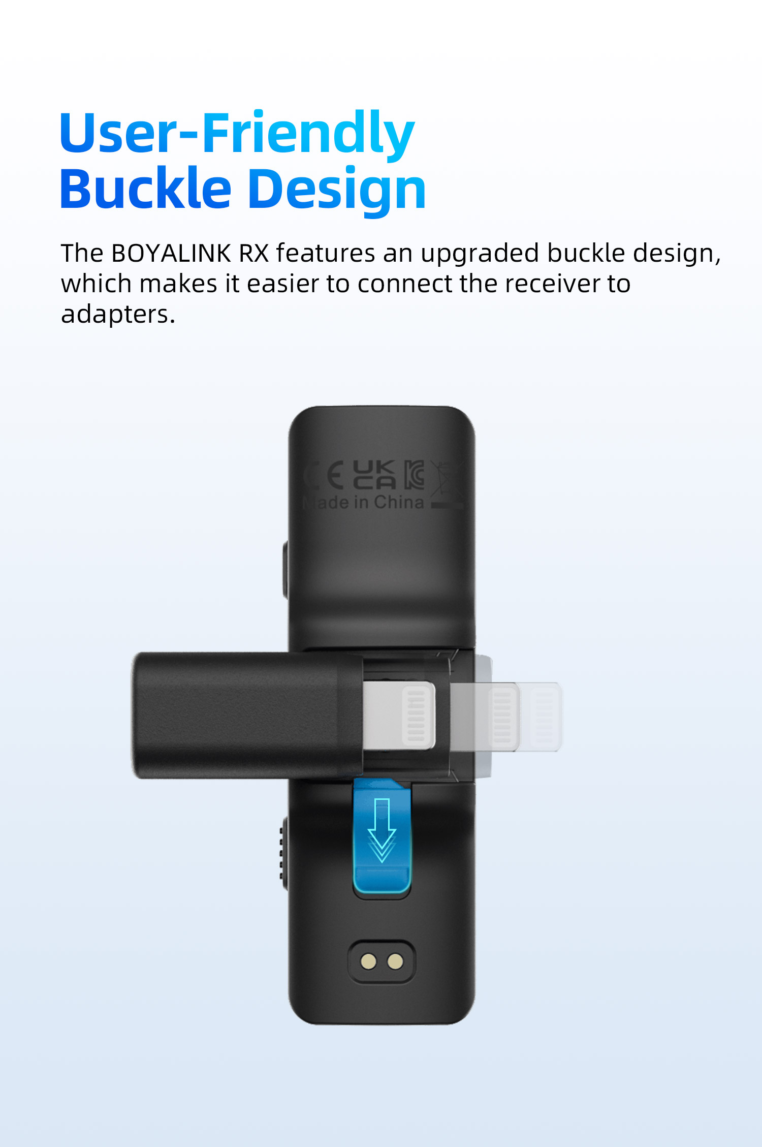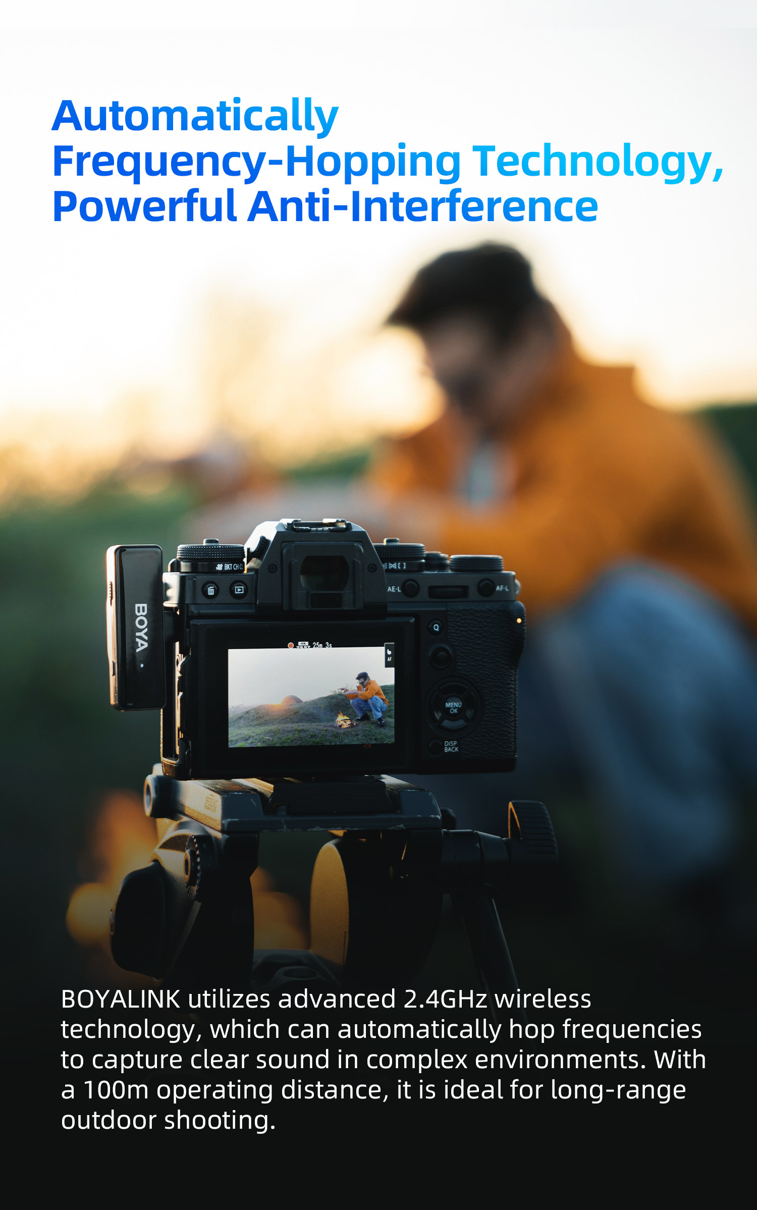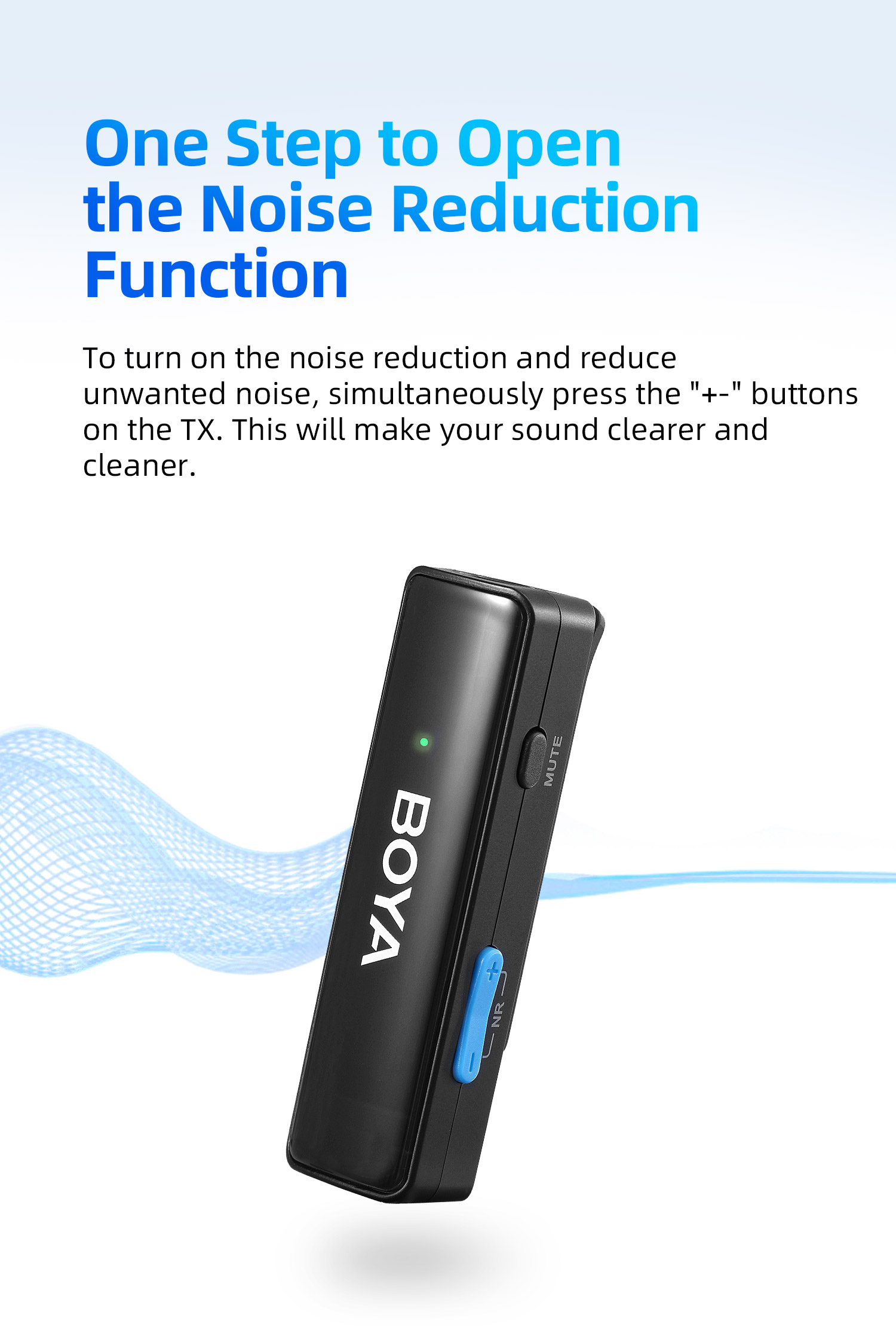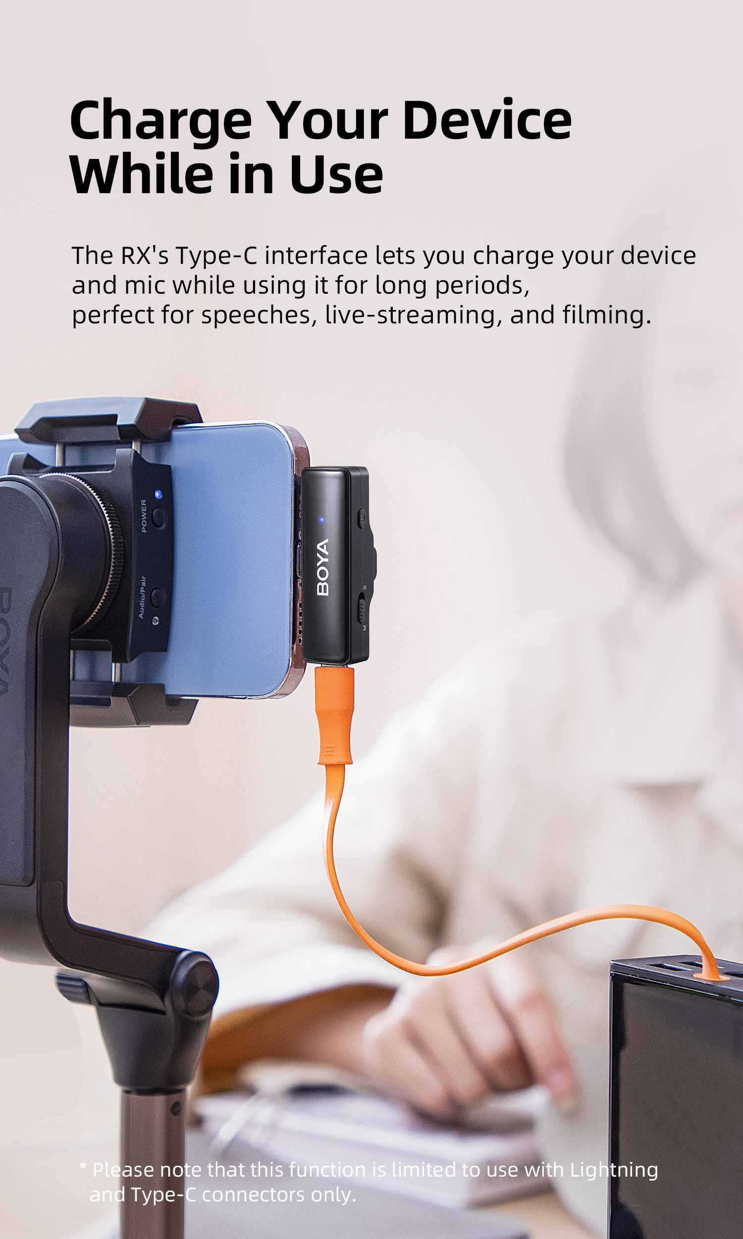 BOYALINK เป็นระบบไมโครโฟนไร้สายพร้อมช่องสัญญาณ 2.4G คู่ BOYALINK มาพร้อมตัวเชื่อมต่อ USB-C, Lightning และ 3.5 มม. TRS เป็นโซลูชันขั้นสูงสุดสำหรับผู้สร้างเนื้อหาที่ต้องการการบันทึกเสียงคุณภาพสูงโดยไม่ต้องวุ่นวายกับตัวเชื่อมต่อหรืออะแดปเตอร์หลายตัว การออกแบบที่เก็บข้อมูลแบบออลอินวัน เทคโนโลยีไร้สายแบบดูอัลแชนเนล และการตั้งค่าที่ใช้งานง่าย ทำให้เป็นตัวเลือกที่เหมาะสำหรับทุกคนที่ต้องการยกระดับการบันทึกเสียงไปอีกขั้น